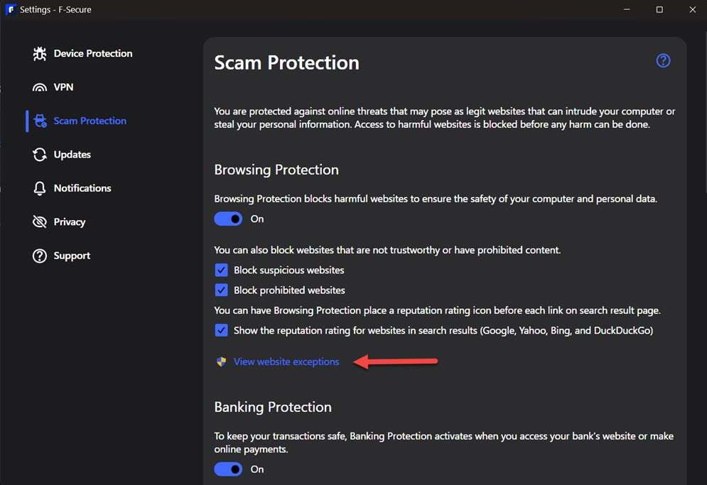 To manually add a site, go to the top left of the app hamburger (3 lines) icon and click on Settings, or open any of the modules and click on Settings from the left hand side, then Edit Settings, then on the Scam Protection tab click on View website exceptions (Settings can also be accessed by a right-click of the system tray icon).