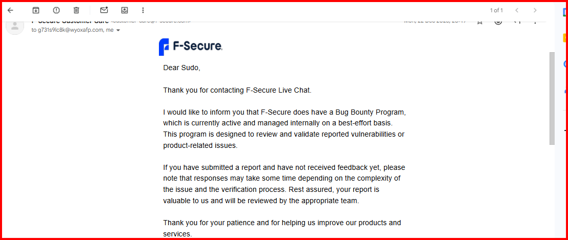 The page dedicated to the Vulnerability Reward Program has not been updated, saying "the current vulnerability reward program will end June 30, 2025." (as well as .well-known's security.txt). So, did you receive any response from "security@f-secure.com" or all communication was within Live Chat and 'further' tickets there?